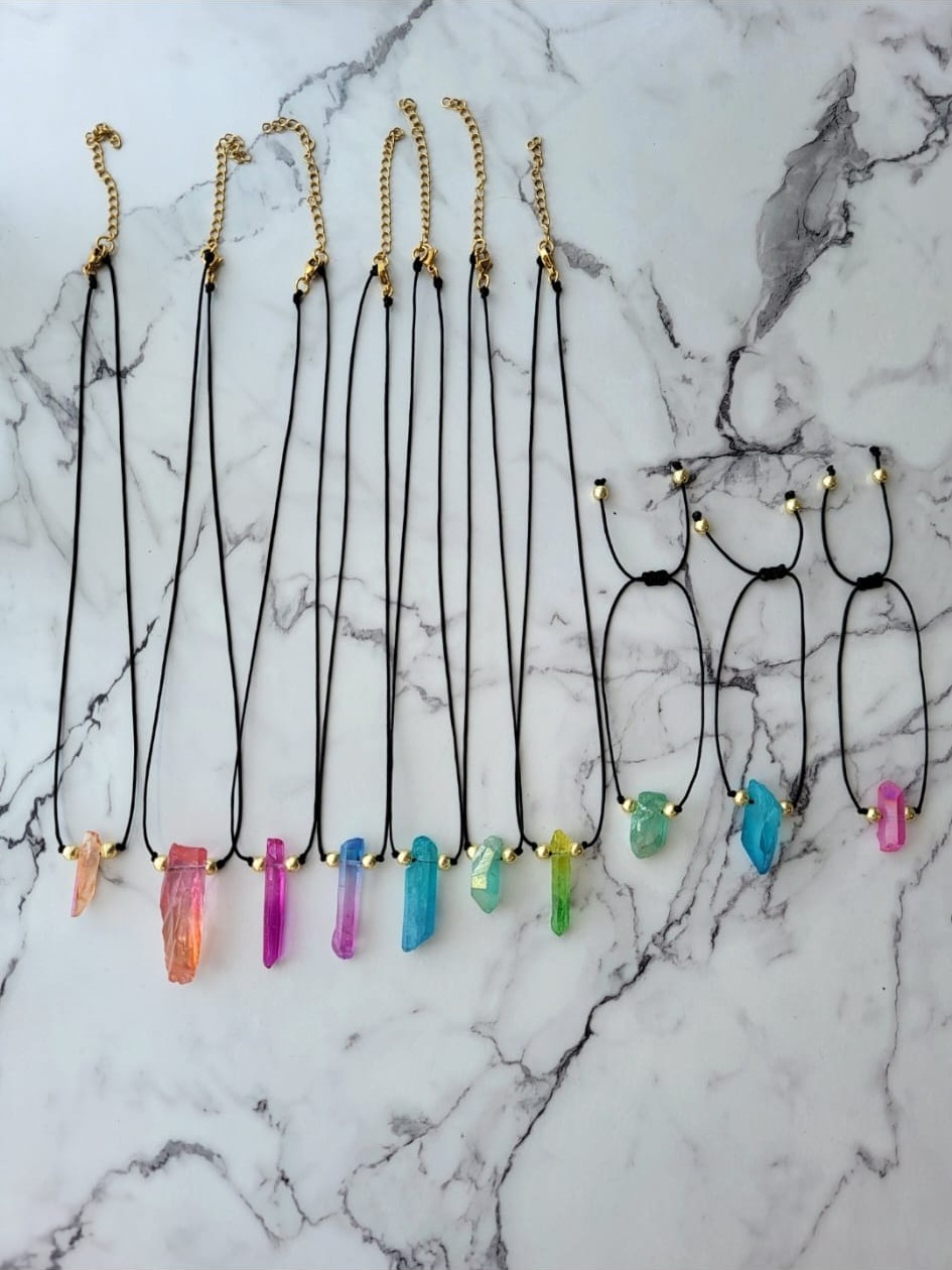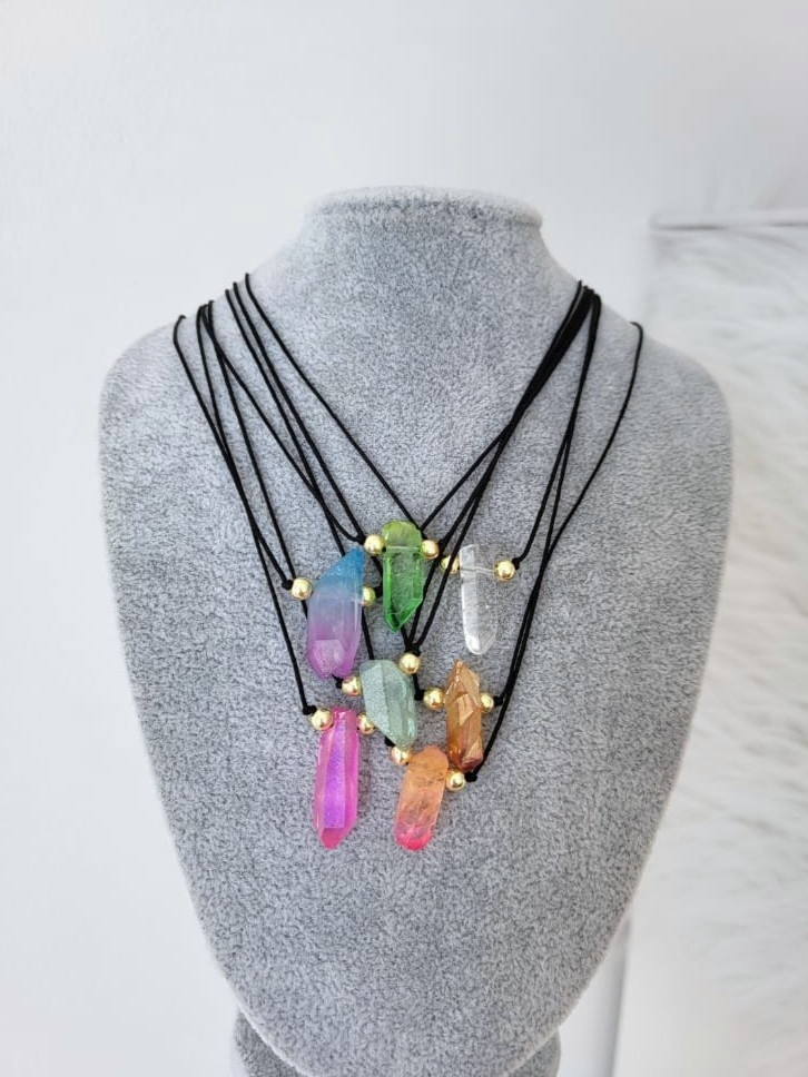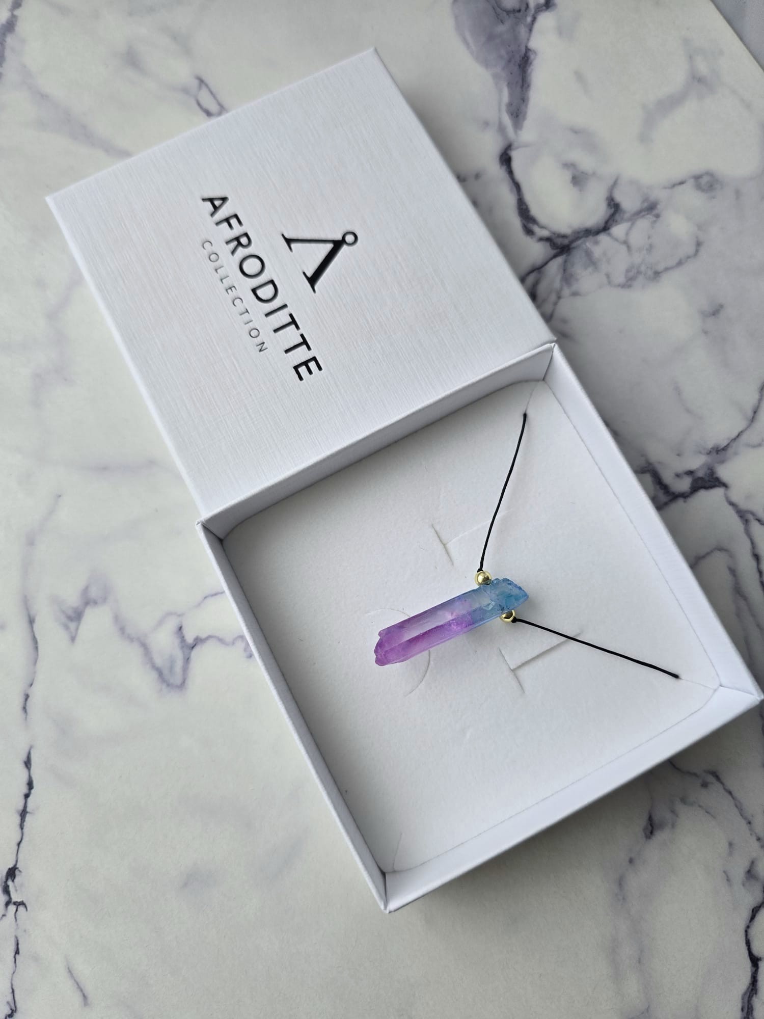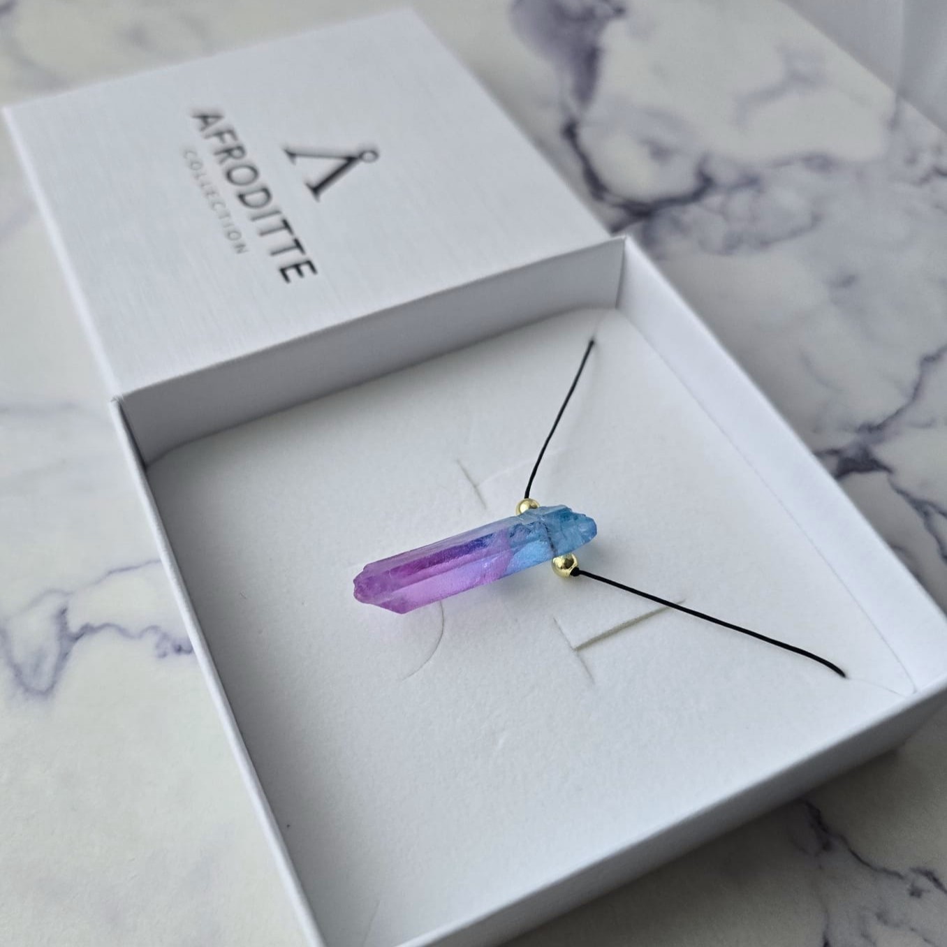 Naszyjnik z kolorowym kamieniem kwarcu na czarnym sznurku – kolor kamienia do wyboru, wykonany w połączeniu z elementami ze stali szlachetnej pozłacanej oraz z ozdobnymi kuleczkami hematytu w kolorze złotym. Łańcuszek zapisany jest na karabińczyk, z możliwością regulacji długości, dzięki dodatkowej przedłużce (ok. +7 cm), z zawieszką z logo Afroditte na jej końcu. Piękne kolory kamieni nadają naszyjnikowi wyjątkowy wygląd. Prezentują się wyraziście i stylowo, pasują zarówno na co dzień, jak i na specjalne okazje.